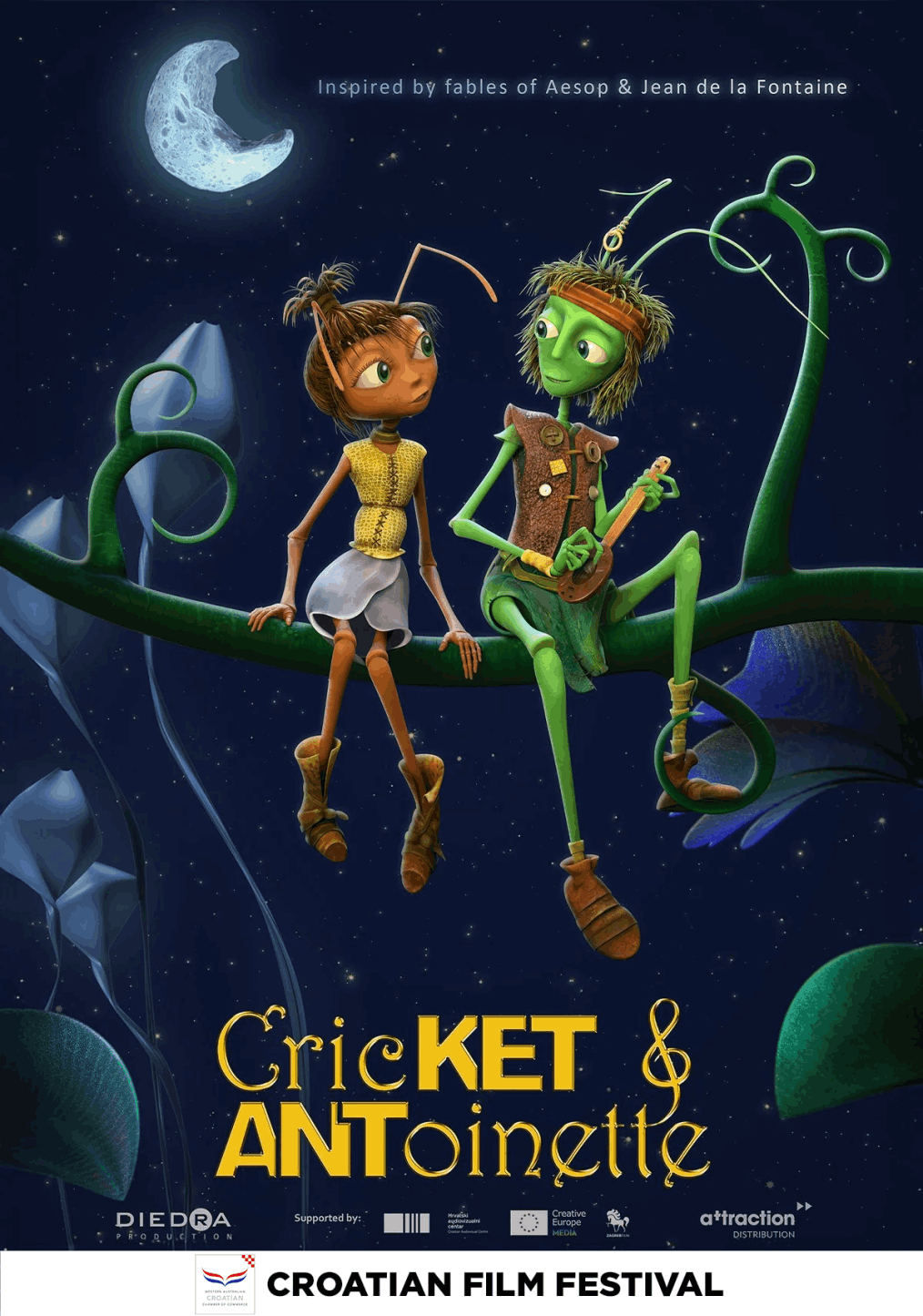 Here is a new take on the famous fairy tale first told by Aesop and Jean de la Fontaine. Ket, a guitar playing cricket, leads a band to entertain the carefree bugs. Nearby lives Antoinette, heiress of the anthill where music is forbidden and only discipline and hard work are allowed. By accident they meet and an affection grows between them. The ant girl tries to warn the crickets of the upcoming winter, to no avail. When Antheodor, an over-ambitious ant, kidnaps Antoinette, it's Ket and his friends who come to her rescue.